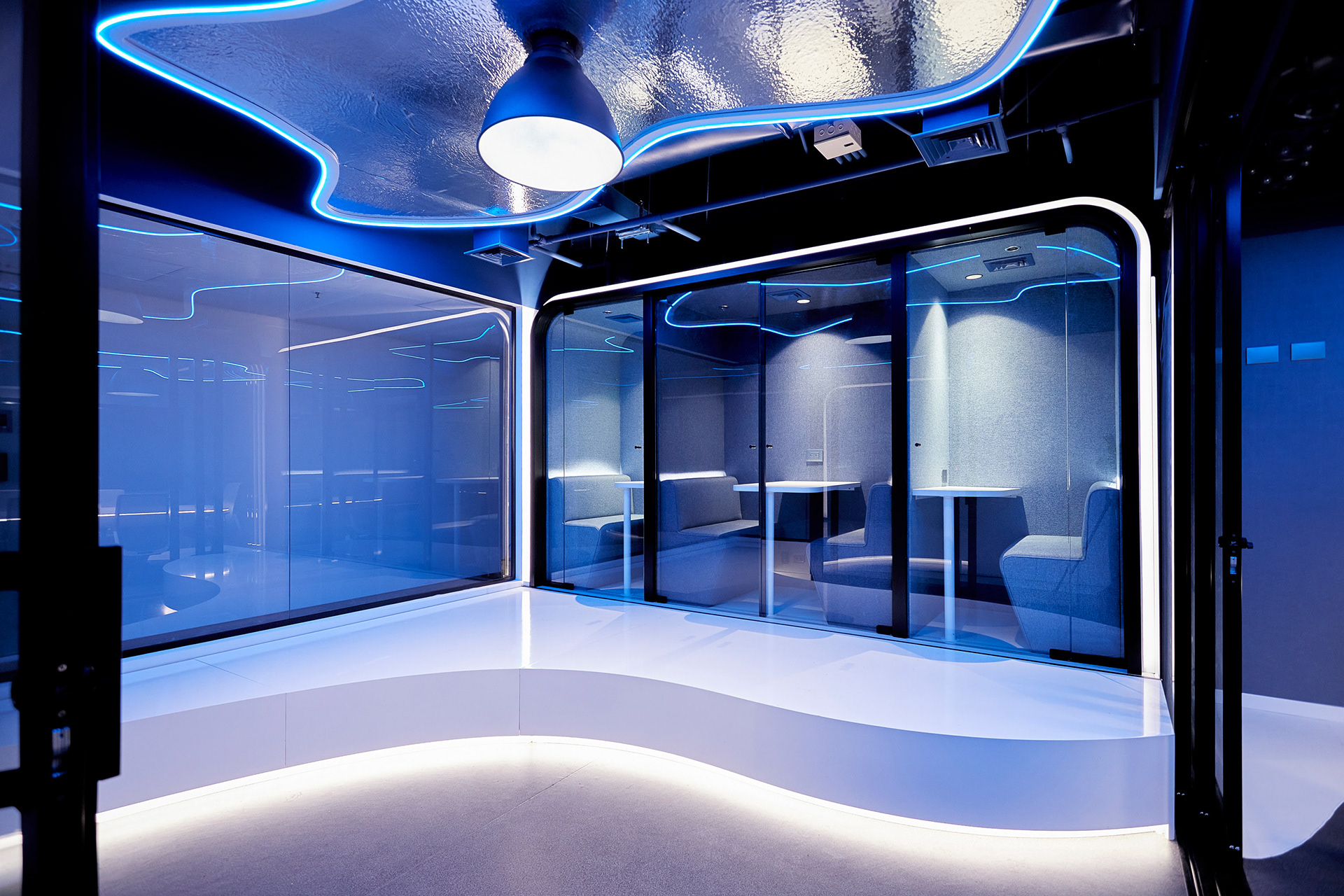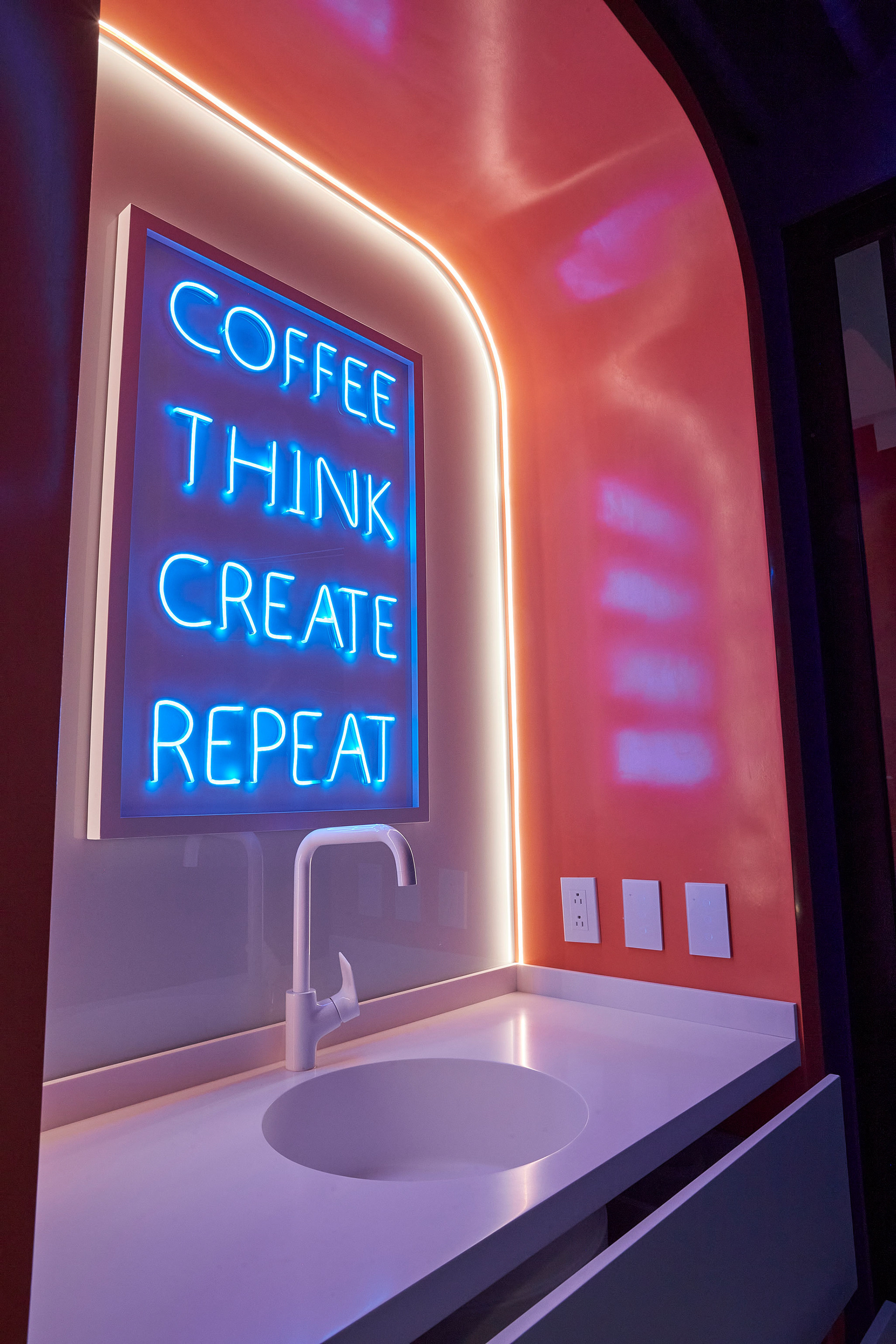 La estación de café es también una cápsula futurista, equipada con una cafetera y un pozuelo, brindando al espacio la funcionalidad que le faltaba y suplir las necesidades de los empleados que hacen uso del espacio.