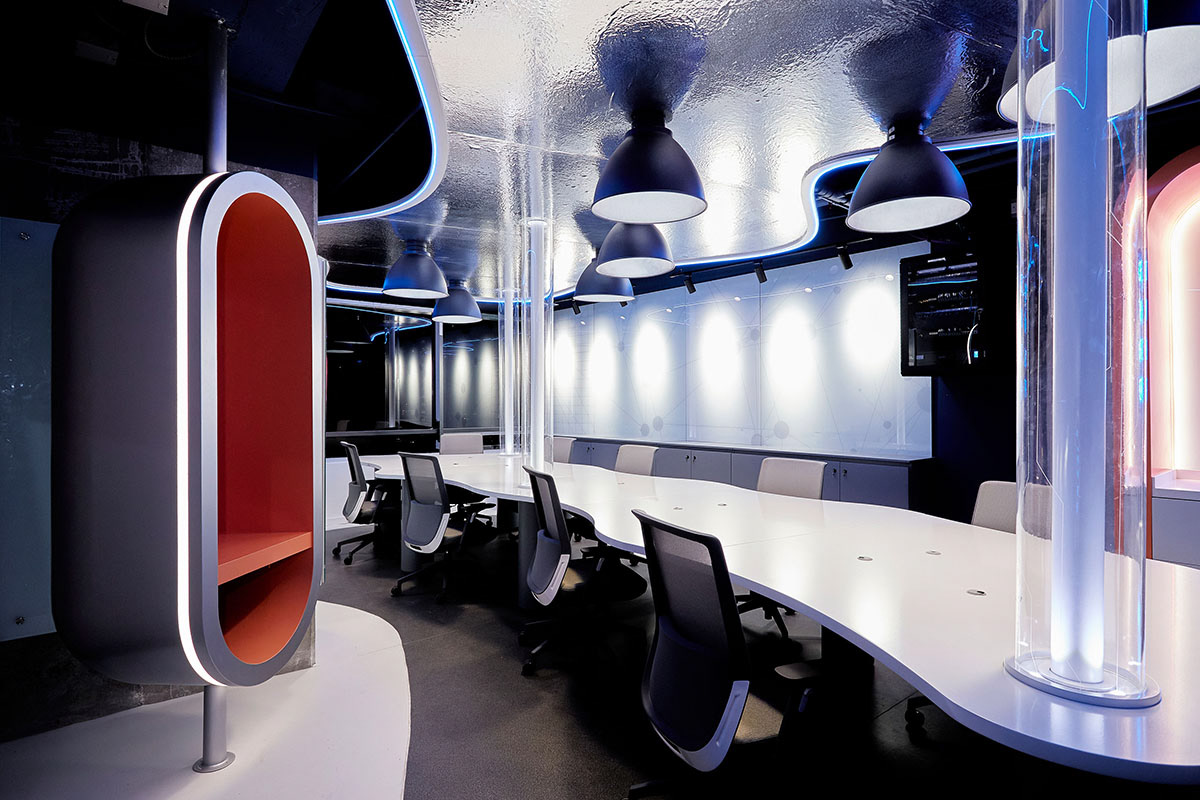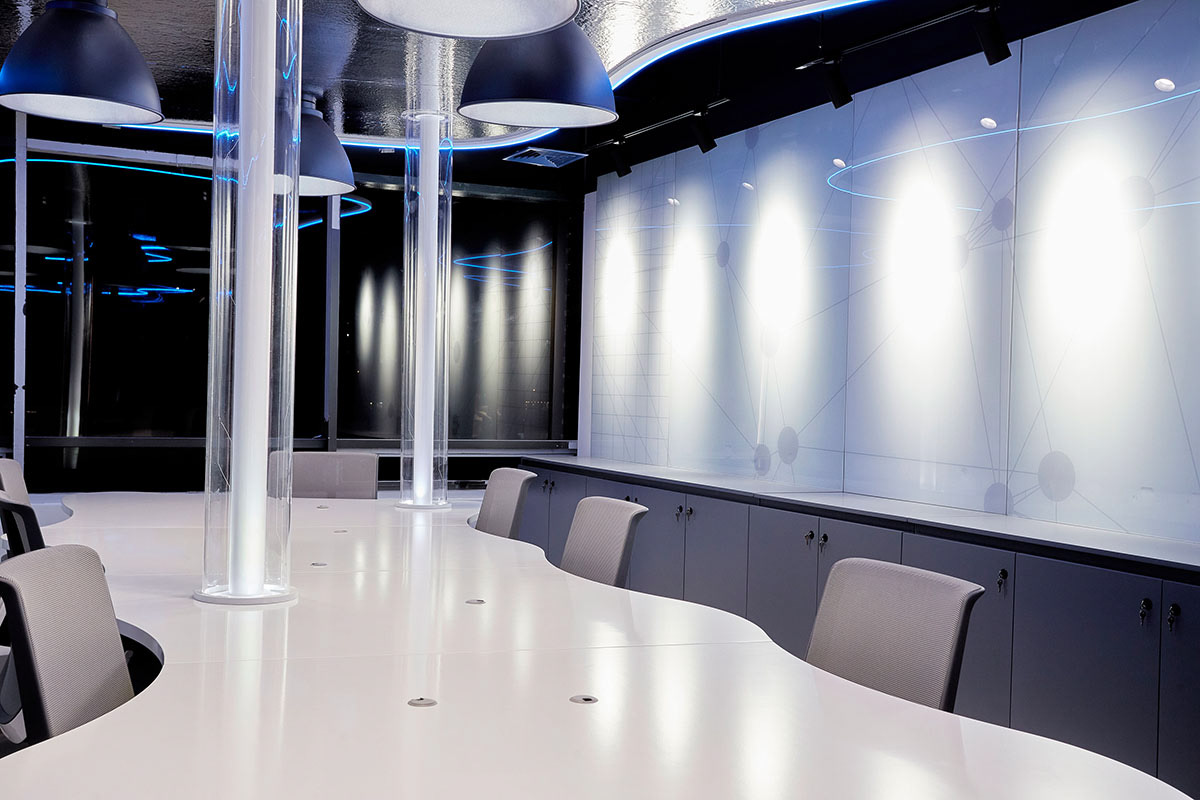 Esta sala de reuniones tiene la característica especial de tener una pantalla interactiva con conectividad bluetooth con cualquier dispositivo que se tenga en la sala, puede ser usada para proyectar, rayar, grabar etc. La mesa fue diseñada y fabricada a la medida con una iluminación perimetral para lograr el efecto futurista, tiene también conectividad para facilitar el uso de dispositivos
