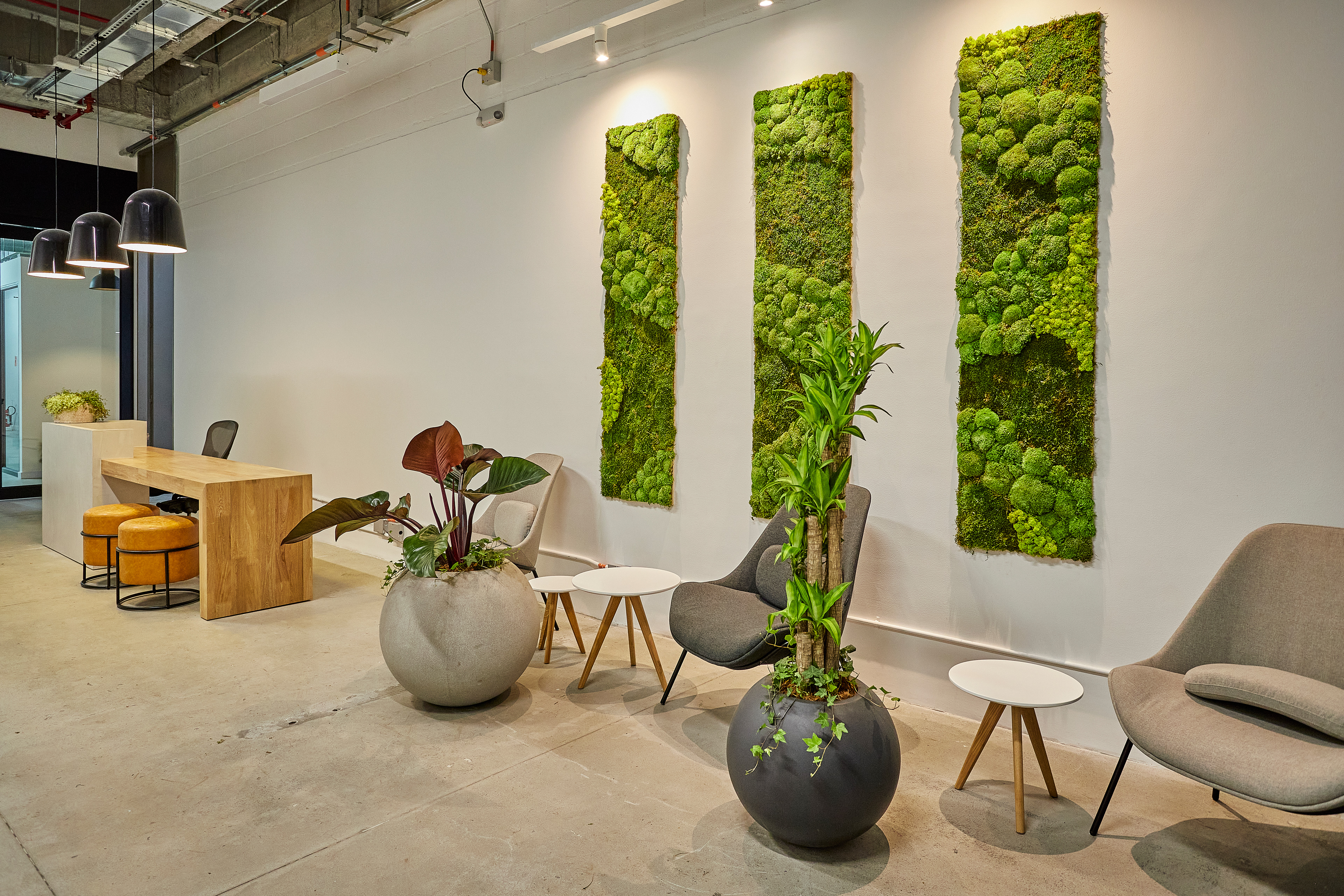 El lobby siempre tuvo la característica en el diseño de tener un escritorio de recepción y una sala de espera, se migró de un concepto muy limpio y blanco en el 2015 a una atmósfera más verde para el 2021, usando los jardines verticales de musgo preservado y macetas esféricas en concreto para dar más personalidad al espacio. Las lámparas negras que enmarcan la recepción con luz cálida trascendieron en el diseño como un comùn denominador.