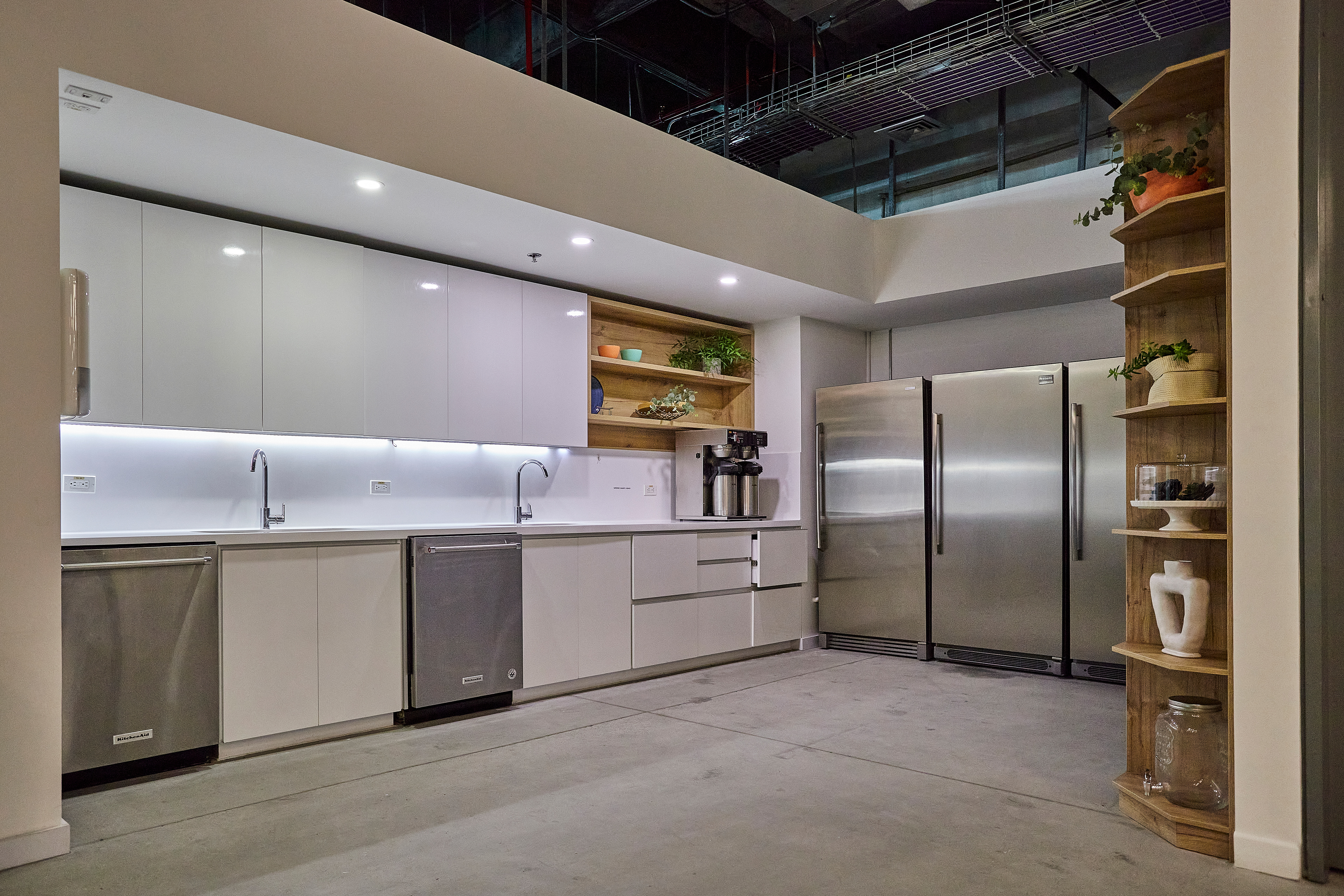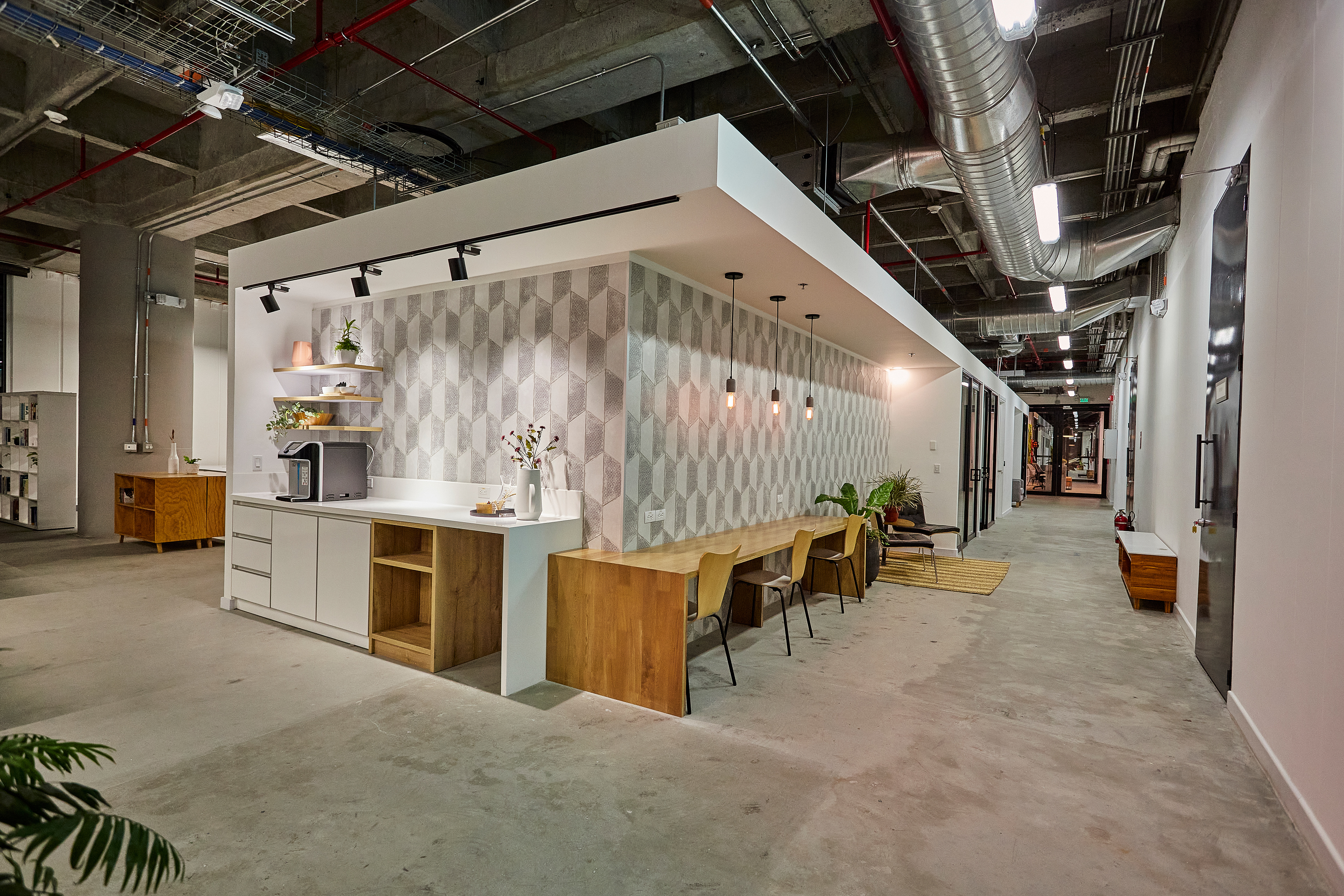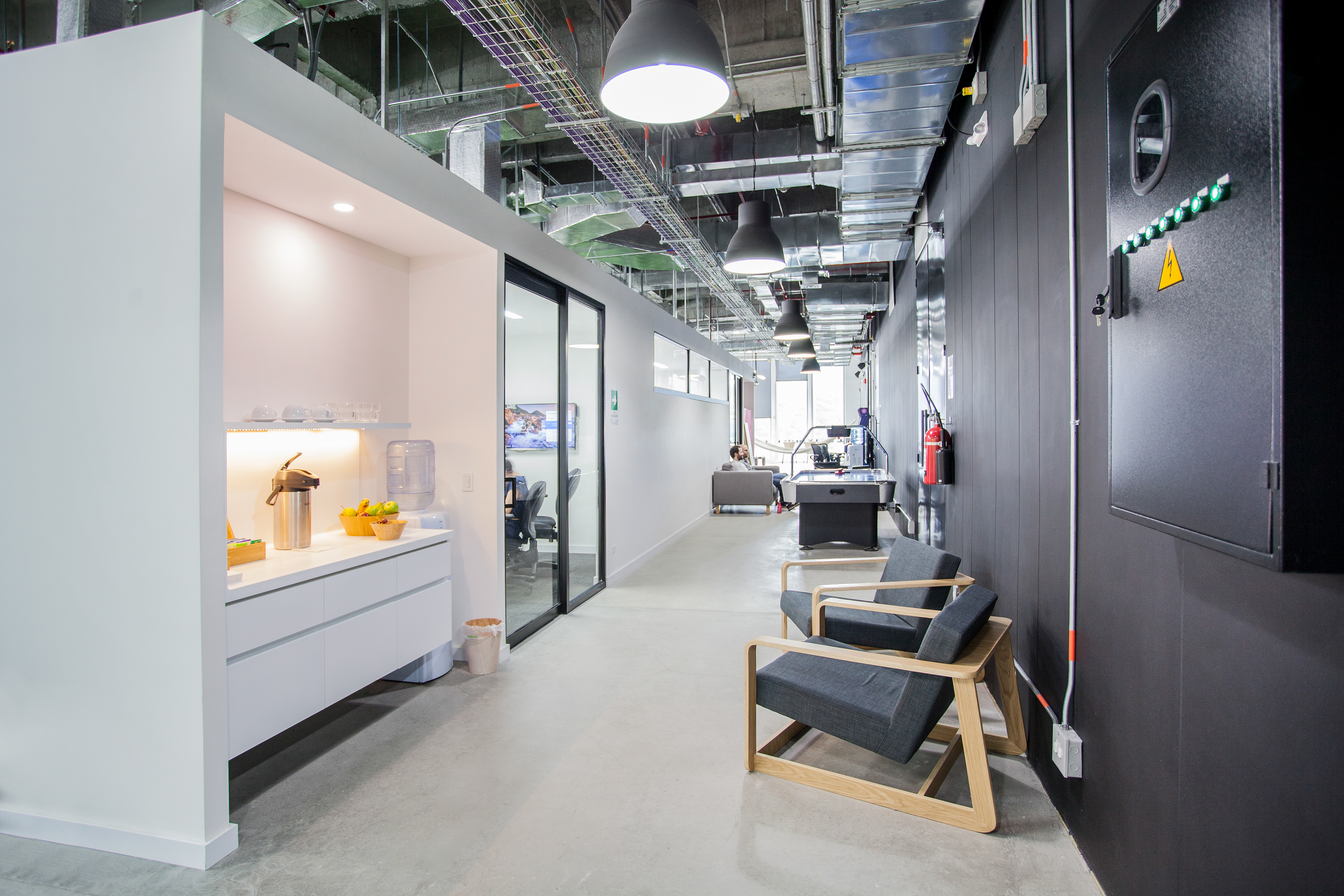 Se diseñan puestos de café y snacks ubicados estratégicamente para permitir a los empleados acceder a ellos sin tener que recorrer toda la oficina. Los mesones están hechos en Corian, material que permite modificarlos fácilmente, hacer empates imperceptibles y tener un mantenimiento que facilita la remoción de manchas y rayones al igual que en la cocina, con iluminación indirecta cálida para resaltar el espacio.