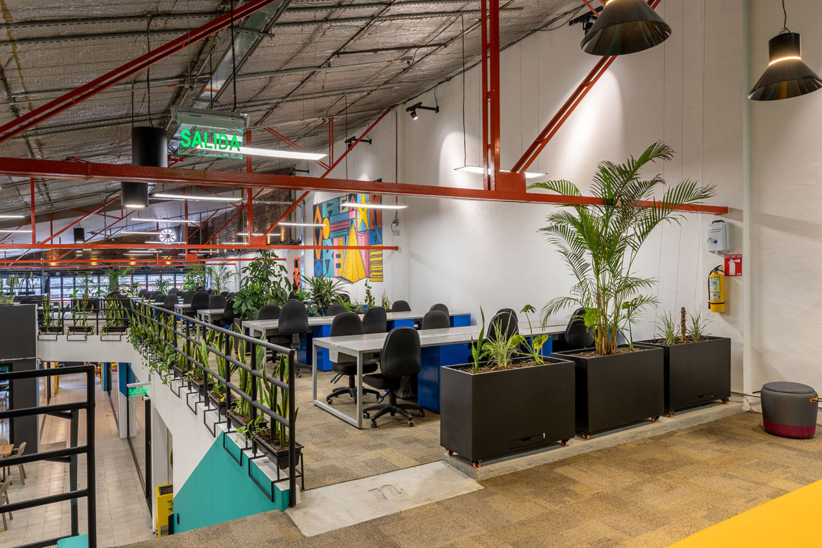 Se adecuaron espacios de servicios e integración como la cafetería, las mesas del comedor y los baños. Se emplea un lenguaje llamativo para emprendedores jóvenes, mediante el uso del color resaltando el espacio y el mobiliario, graffitis y texturas de lo existente, haciéndolo congruente con el tema que se venía trabajando en los otros espacios