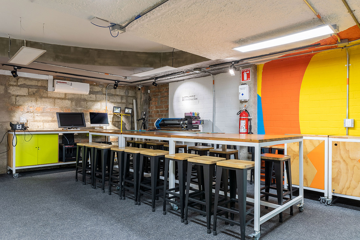 Los talleres son espacios dispuestos para los emprendedores, donde los que lo necesiten pueden hacer uso de la maquinaria para generar sus prototipos. Se deja el ladrillo a la vista en los muros, resaltando la belleza de lo simple y lo existente con luces cálidas que potencian sus texturas. El mobiliario de estos espacios fue diseñado por ARQ medios y construido con madera cultivada.
