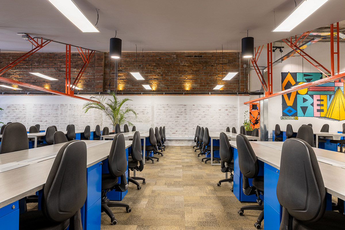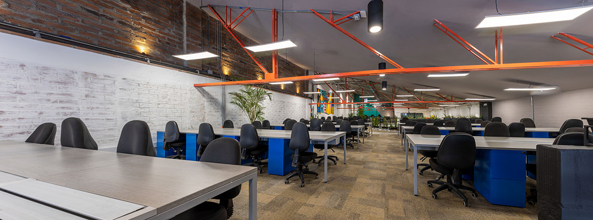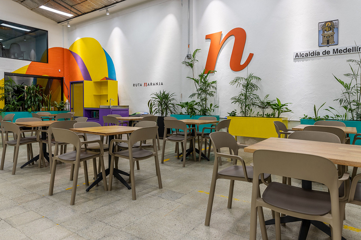 Ruta Naranja fue el proyecto pionero en la temática para emprendedores, donde se generó un coworking reutilizando el mobiliario y las alfombras de proyectos anteriores de Ruta N. Hacemos el espacio más llamativo resaltando la estructura del techo con colores vibrantes y con graffitis de artistas locales en las paredes.